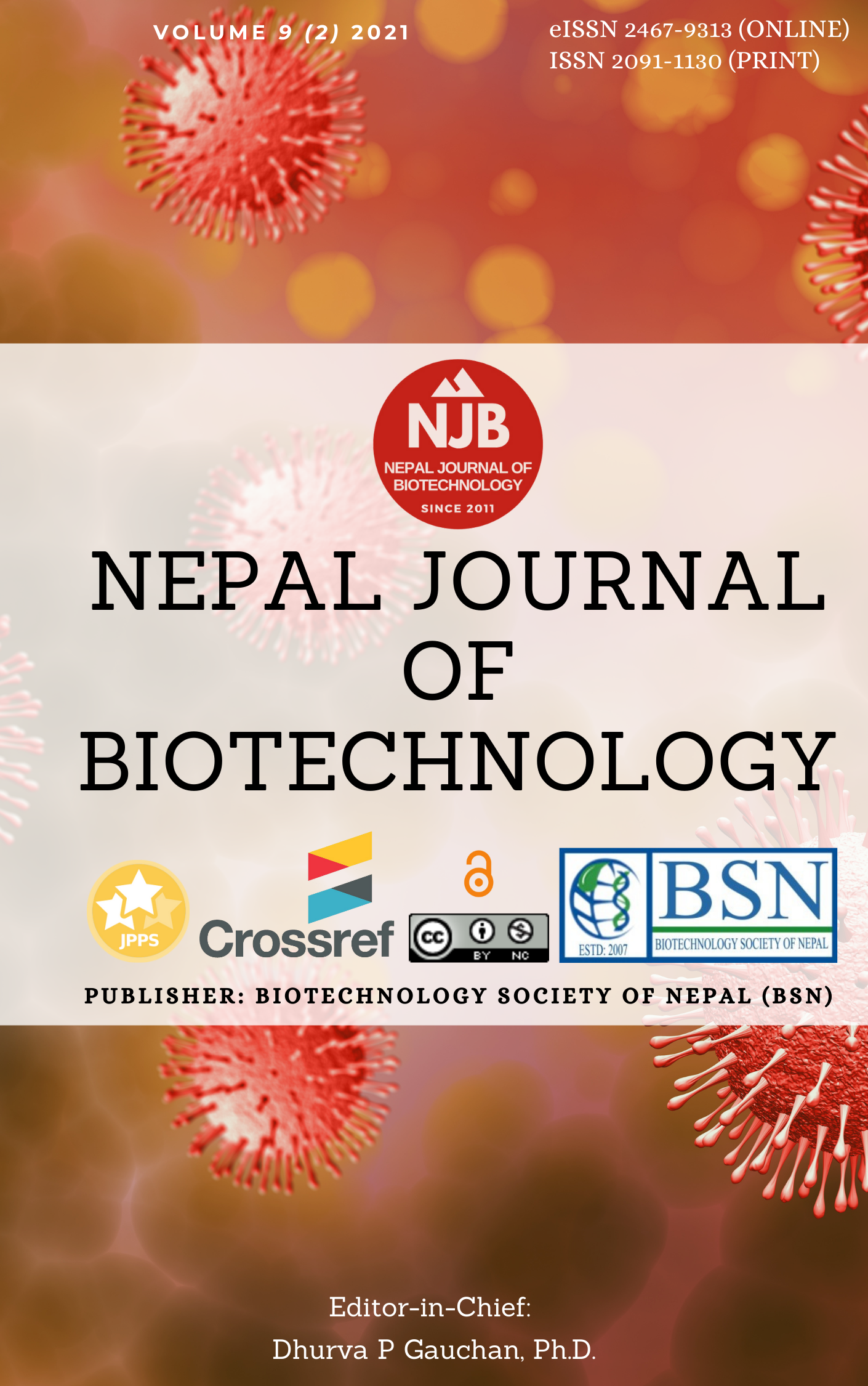 Nepal Journal of Biotechnology (NJB) is an open access, peer-reviewed, indexed and refereed international online journal run by volunteer researchers and has unique ISSN 2091-1130 (Print) and eISSN 2467-9313 (Online) numbers. NJB publishes full-length research articles, review articles and method articles in the fields of Biotechnology, Molecular Biology, Genetic Engineering, Microbiology, Cell Biology, Parasitology, Biochemistry, Medical Science, Plant Science, Animal Science, Bioinformatics and other Omic Sciences viz. Bioprocess, Biochemical Engineering, Fermentation Technology, Organic chemistry related to Biotechnology and provides a unique DOI (Digital Object Identifier) for every article published.